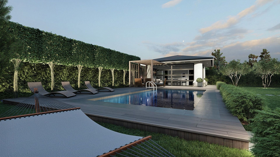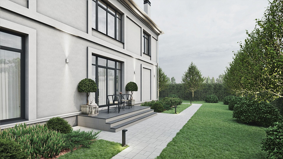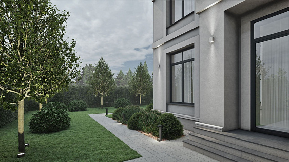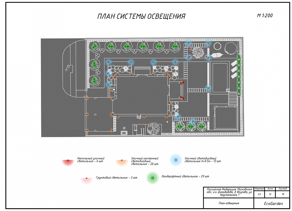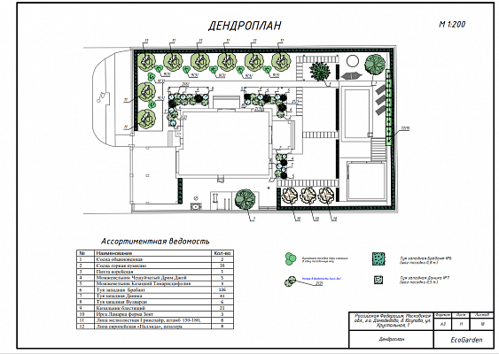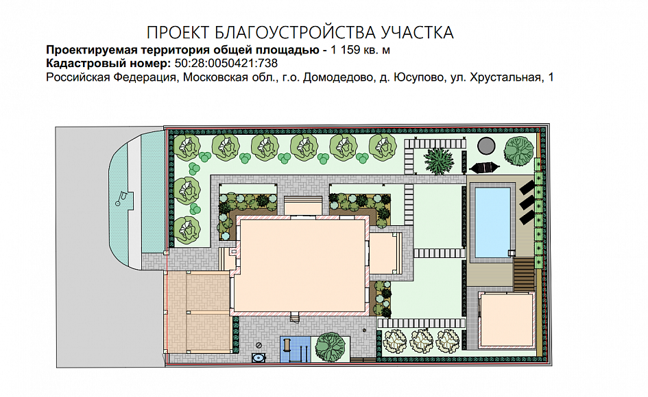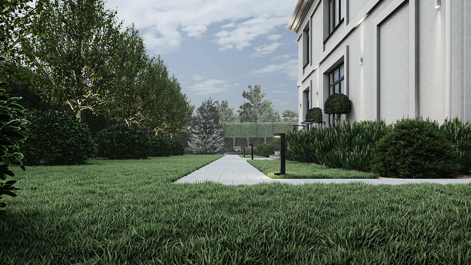 Ландшафтный проект участка общей площадью 12 соток в деревне Юсупово г.о. Домодедово: генплан, эскиз, фоторендеры, топографическая съемка, дендроплан, план освещения, спецификации, ведомости.